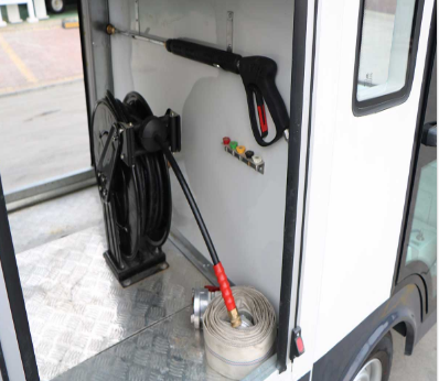 2.前有两个可旋转、高度可调的高压喷头,下方有一排喷淋头,驾驶室内操作,可自动实现对路面及路牙聚积的污泥清除、狭窄道路洒水等;