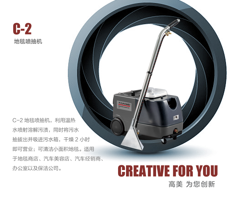 C2地毯喷抽机,利用温热水喷射溶解污渍,同时将污水抽拔出并吸进污水箱,干燥2小时即可营业;可清洁中等面积地毯。