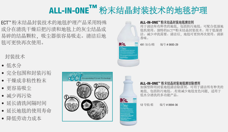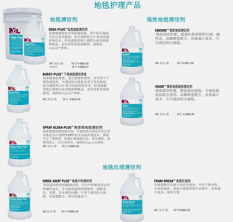 由NCL提供成熟配方产品的地毯护理解决方案,可以延长地毯的使用寿命,维护地毯的靓丽色彩,提供使用者满意的环境氛围和舒适度。NCL提供的全方面的地毯护理产品包括清洁剂、除渍剂、地毯防护剂及其它的配套产品,让使用者在维护地毯时可以轻易的使用产品,并有效控制成本。特别是我们的ECT™和EPT™粉末结晶封装技术的防再次污染配方的地毯清洁剂将污垢包裹成一个松脆的、不粘的粉末残渣,通过常规的真空吸尘器很容易去除。使地毯更加美丽干净。其结果是延长了地毯清洗间隔时间,延长了地毯保持干净的时间。